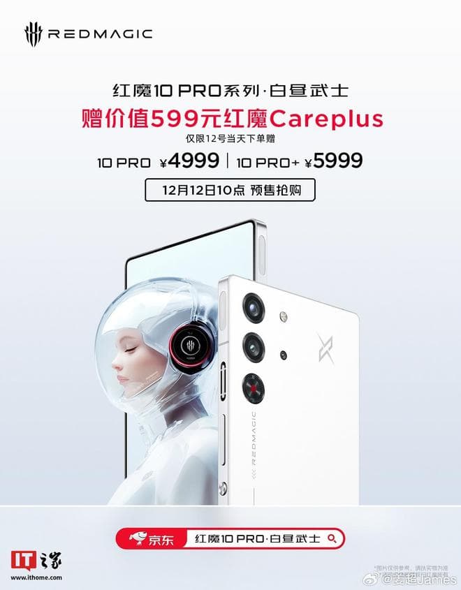 IT之家注意到,红魔 10 Pro 系列“白昼武士”配色今日上架电商平台,将于 12 月 12 日早 10 点开售,当天下单赠送价值 599 元红魔 Careplus: