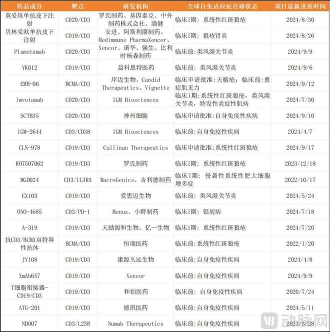 在海外MNC中,罗氏的CD20/CD3双抗、安进BCMA/CD3双抗陆续开展了TCE双抗在自免适应症的临床试验,这也意味着,TCE双抗有可能打开自免这一广阔的市场空间。