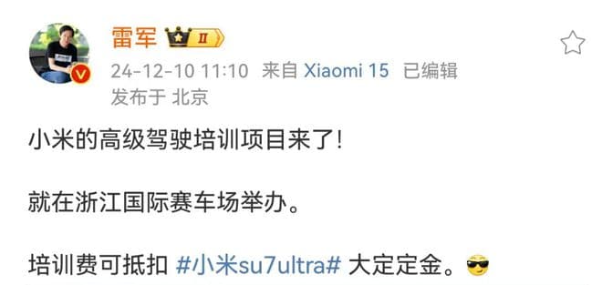 同时,雷军在12月10日发布微博提及,小米高级驾驶培训项目在浙江国际赛车场举办。