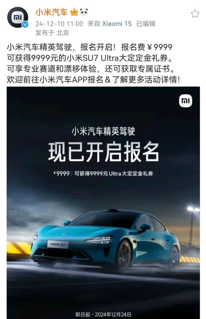 12月10日,小米汽车官宣:“小米汽车精英驾驶现已开启报名,报名费为9999元。”