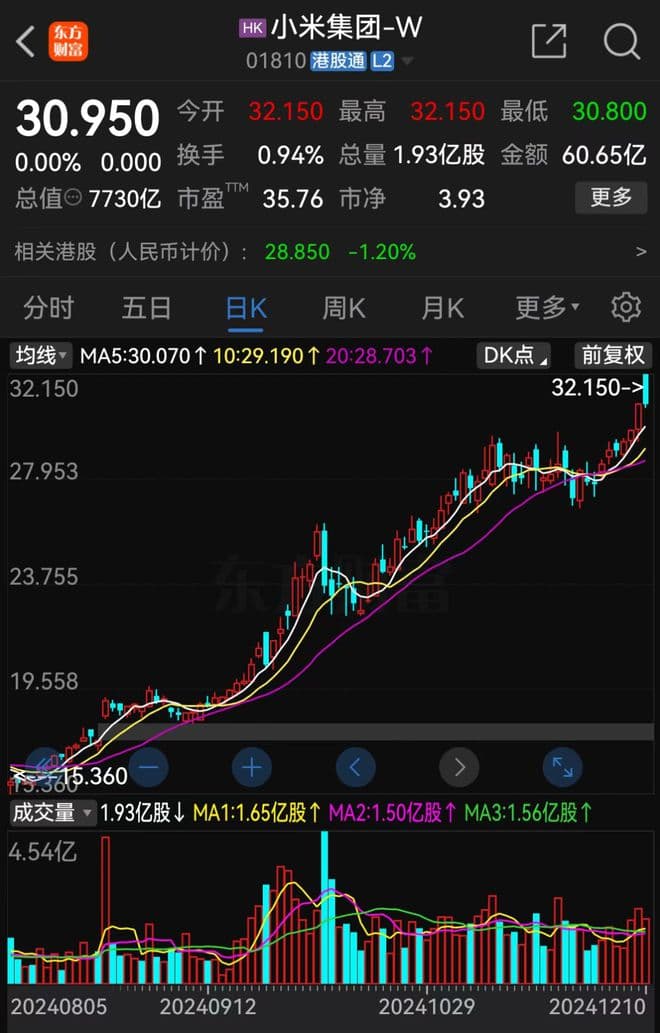 12月10日收盘,小米集团的股价报30.95港元/股,总市值为7730亿港元。