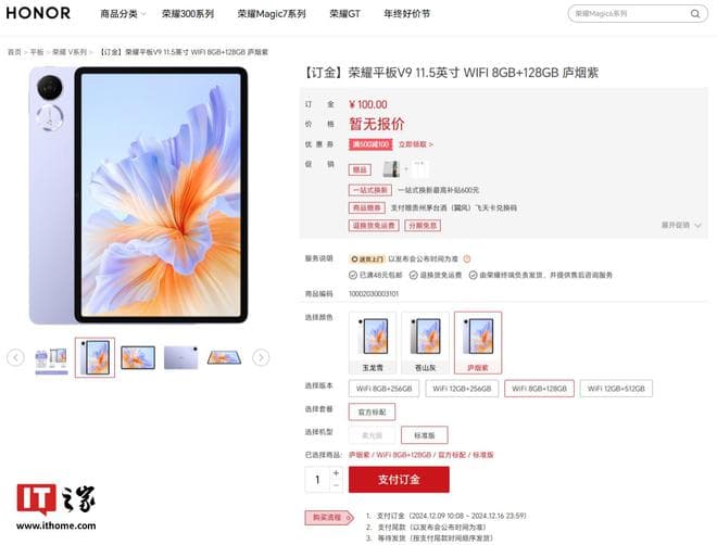 据IT之家此前报道,荣耀平板 V9已上架荣耀官网开启预约,系列新机将提供 4 种存储规格、拥有柔光版、标准版 2 种屏幕形态。此外,荣耀工作人员 @林林-一枝小白兔 还透露了新平板部分细节信息:厚度为6.11mm,拥有 Magic Pencil 3和亲选键盘等配件。
