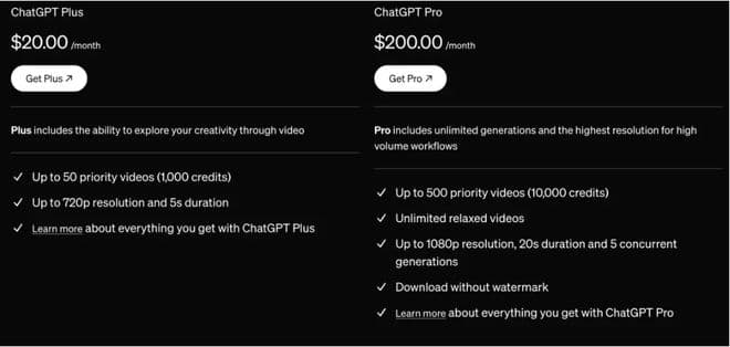 在定价方面,Sora主要提供两种方案。月收费20美元的ChatGPT Plus用户可免费使用Sora,每月最多生成50个720p视频,时长为5秒。每月支付200美元的ChatGPT Pro用户最多可生成500个高级视频,不限次数享受“慢速”生成视频的权限,分辨率高达1080p,持续时间为20秒,并且下载的视频无水印。