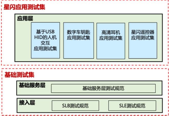 础测试集由星闪接入层测试标准和基础服务层测试标准组成;HID(人机交互)测试集、数字车钥匙测试集和高清音频测试集分别由相应的星闪应用层原子能力标准和应用配置与管理标准组成。