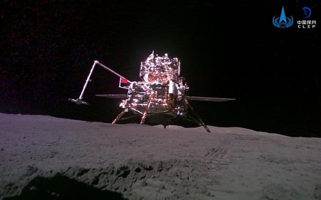 ▲ 6 月 3 日,嫦娥六号携带的“移动相机”自主移动后拍摄并回传的着陆器和上升器合影