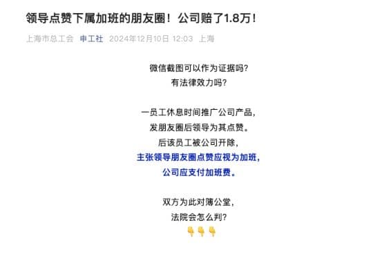 12 月 10 日,上海市总工会官方公众号发文,称在近期的一起案件中,领导点赞下属加班朋友圈被认定为加班证据,相关话题昨日也在微博登上热搜。