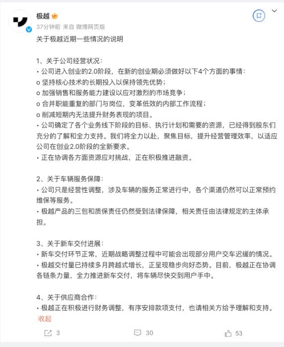 昨晚,极越官方发文,说明了极越近期的一些情况。