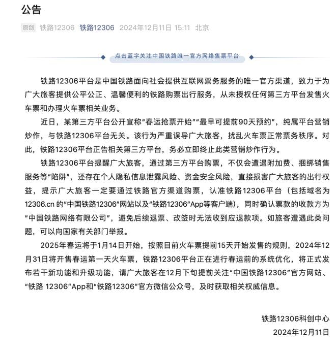 昨日,铁路 12306 发布公告,表示某第三方平台公开宣称「春运抢票开始」「最早可提前 90 天预约」,纯属平台营销炒作,与铁路 12306 平台无关。