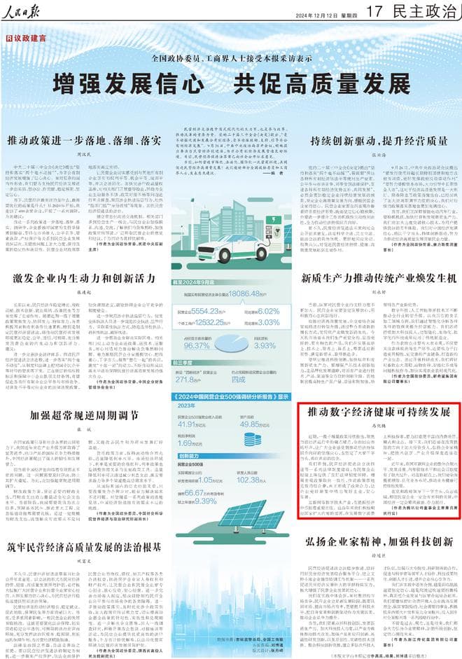 12月12日出版的《人民日报》在第17版刊发了整版报道《全国政协委员、工商界人士接受本报采访表示:增强发展信心 共促高质量发展(议政建言)》。