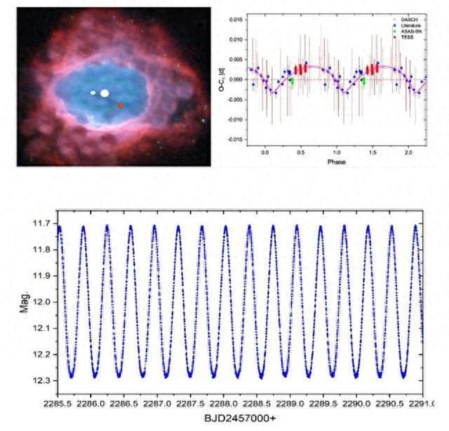 通过对这颗双星100多年的光变数据进行分析(包括美国国家航空航天局的凌日系外行星巡天卫星(TESS)的高精度测光数据),团队发现其亮度极大的信号到达地球的时间(极大时刻)呈现出周期性变化(如图1(上)(右)所示)。这可解释为第三天体引起的光时轨道效应,即当第三天体存在时,中间双星将围绕三星系统的公共质心转动而引起光极大时刻周期性的提前和推迟。进一步的分析计算表明,这颗第三天体的最小质量为60倍木星质量,介于行星和最小质量的恒星之间,因而是一颗褐矮星。褐矮星的中心通常不足以维持稳定的氢核聚变反应,所以也被称为是“失败”的恒星。这是首次在非掩食双星中利用反射效应发现的第三天体,也是第一颗绕行星状星云中心双星转动的褐矮星。行星状星云中间的热亚矮星双星是原初双星(前身天体)中的主星进入渐近巨星分支阶段并经历共同包层演化之后形成的。原初双星中褐矮星第三天体不可能在渐近巨星分支和公共包层演化阶段幸存下来,揭示了它可能是在共同包层演化阶段形成的第二代褐矮星,为褐矮星和行星的形成提供丰富的信息和限制。