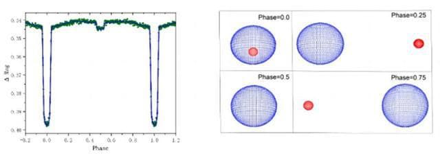 船帆座KV的前身天体是由大质量的B型主星和小质量的M型红矮星次星组成的极小质量比双星系统。然而由于次星非常暗弱,其亮度对整个系统的贡献不到1%,这样的双星极为难于发现。探测小质量星对大质量星的掩食成为唯一有效的方法。为了搜寻这样的特殊系统,团队利用我国LAMOST光谱巡天数据和欧洲航天局研制的盖亚(Gaia)空间卫星数据,并结合TESS所提供的高精度连续测光数据开展系统分析与研究。成功发现了一系列含暗弱伴星的B型小质量比双星。其中名为TIC 260342097的双星系统质量比仅为0.067,这意味着主星的质量是次星的约15倍。图2(左)展示的是目标双星TIC 260342097的TESS光变曲线。从图可以看出,光变曲线的振幅很小,不到0.06个星等。图2(右)展示了TIC 260342097的两子星几何位型,其中蓝色表示B型主星,红色表示暗弱M星红矮星伴星。这种罕见的极端质量比B型双星系统为理解双星系统的形成与演化提供了宝贵的信息,揭示了这一系统是由盘破裂过程形成,丰富了人们对双星系统形成路径的认识,也为研究双星的后续演化提供了新的视角。