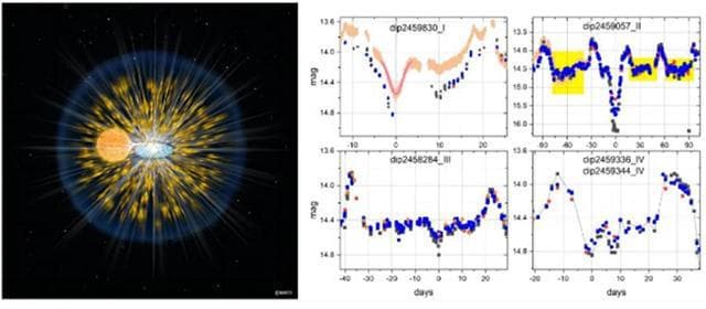 图4 激变变星爆发的艺术图(左图;图片来自NAOJ)和Karachurin 12不同类型的周期性变化的模式(右图)