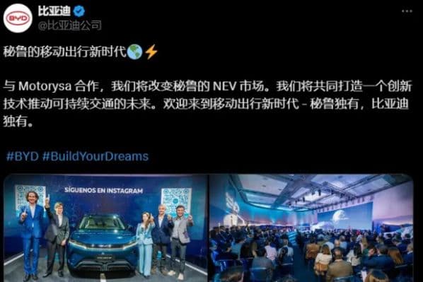 比亚迪表示,与Motorysa合作,我们将改变秘鲁的NEV市场。我们将共同打造一个创新技术推动可持续交通的未来。