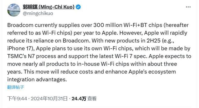 今年10月末,苹果“预言帝”、天风国际证券的分析师郭明錤在社交媒体X透露,博通现在一年为苹果供应3亿块Wi-Fi芯片,苹果明年可能会减少对博通芯片的依赖,推出自研芯片,iPhone 17等明年下半年发布的新品将采用苹果的自研芯片,它们将由台积电的7纳米工艺制造,支持最新的Wi-Fi 7规格。
