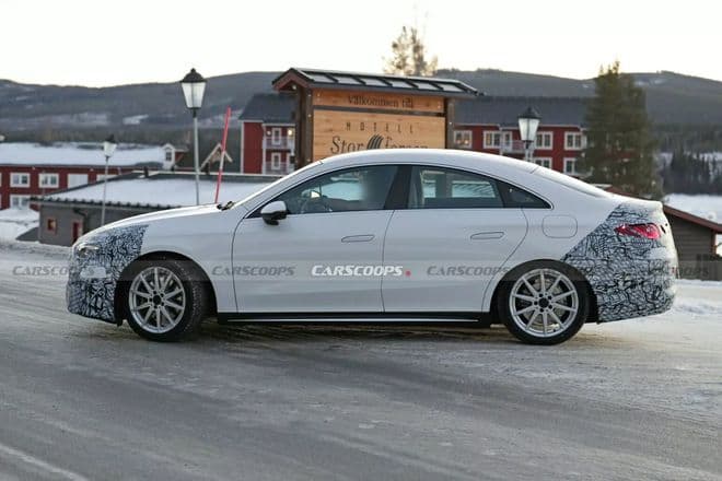 全新 CLA 电动汽车的车头、车尾仍然覆盖着伪装,但车身已经一览无遗。新车拥有更流畅的线条,整体设计上加入了更多 EQE、EQS 的设计元素,配备有隐藏式门把手,意图营造出优雅的姿态。