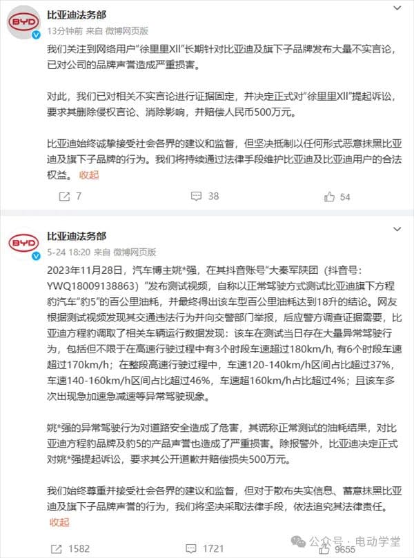 比亚迪法务部起诉博主“徐里里Xll”:要求删除侵权言论,赔偿500万,博主回应:将积极应诉