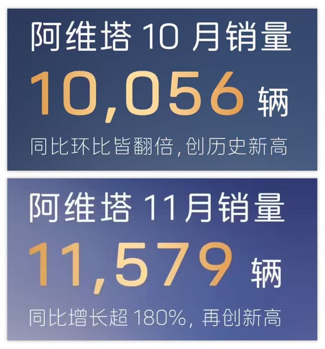 比如阿维塔,2023 年全年销量为 2.76 万辆,但在今年加入“增程神教”后,10 月和 11 月的单月销量都突破了 1 万辆,效果立竿见影。