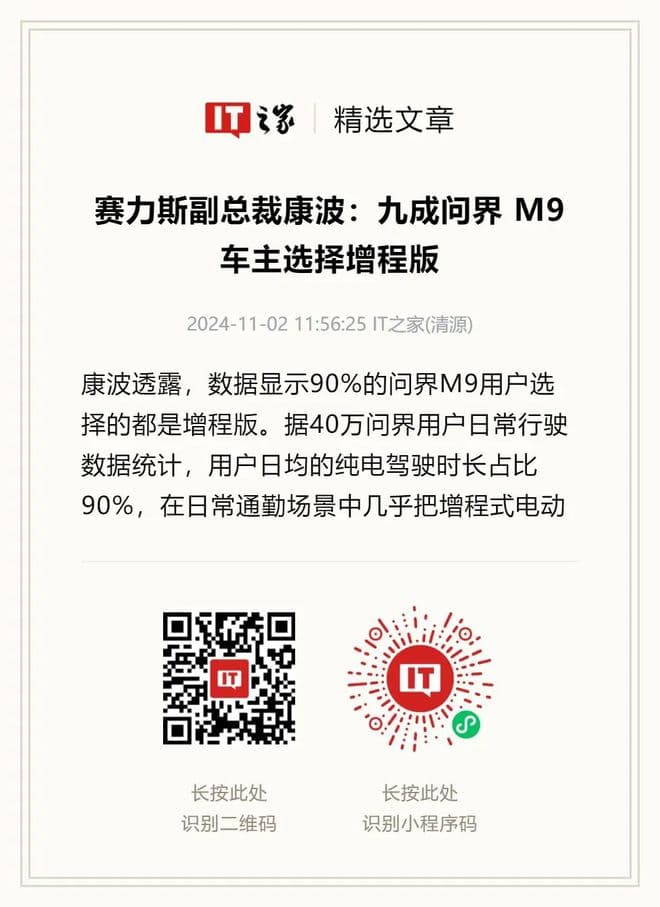 像赛力斯副总裁康波就曾透露,据 40 万问界用户日常行驶数据统计,用户日均的纯电驾驶时长占比 90%,在日常通勤场景中几乎把增程式电动车当纯电车使用。