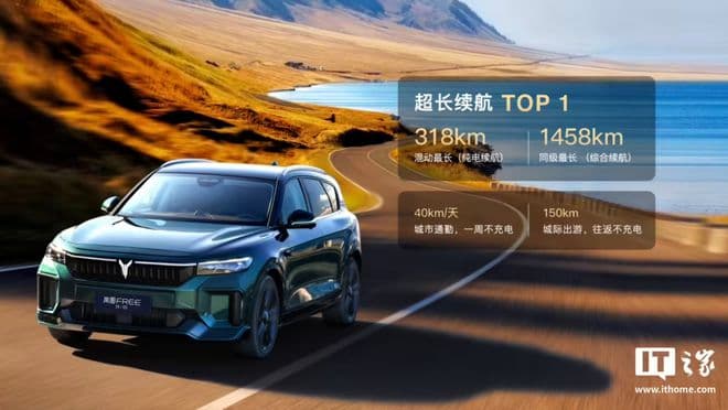 再比如岚图 FREE 318:搭载 43 度电池,后驱环游版纯电续航 318 km,综合续航可达 1458km;四驱探索版纯电续航 259km,综合续航 1357km。