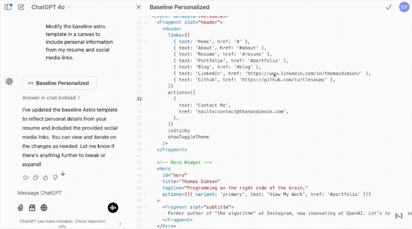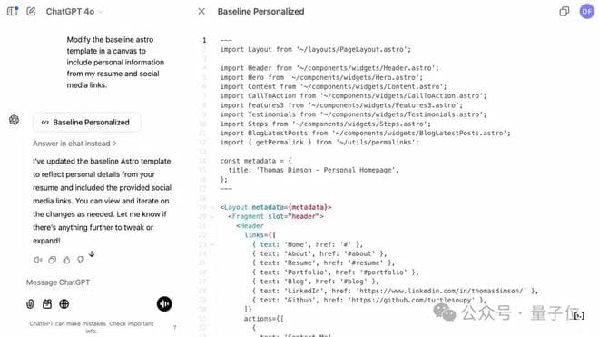 只需一句Prompt,Projects就能帮你生成修改个人网站对应的代码了: