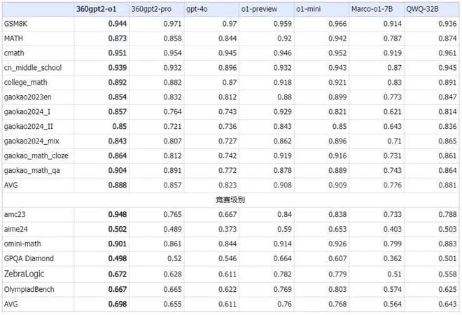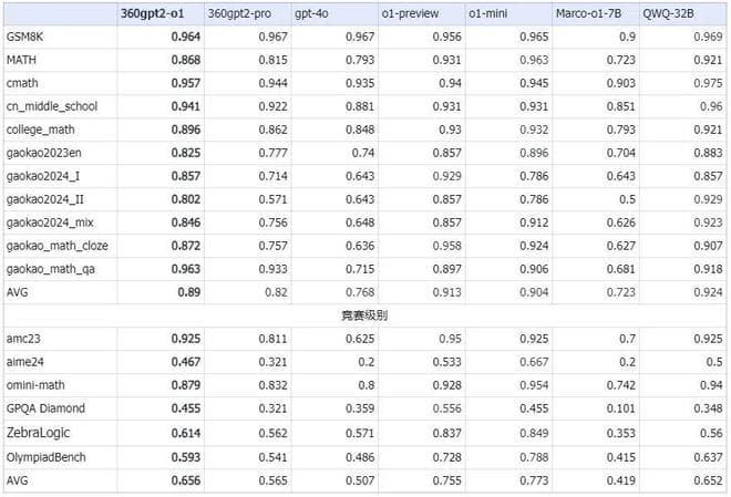 在多项基础数学评测(如 MATH、高考数学)以及权威数学竞赛(包括 AIME24、AMC23)中,360gpt2-o1 均取得了显著的成绩,不仅超越了前代模型 360gpt2-pro,也优于 GPT-4o 模型。