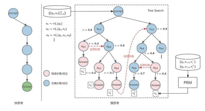利用蒙特卡洛树搜索探索多样化解决方案,并引入 LLM 进行错误验证和纠错,模拟人类逐步推理和反思的过程,最终形成包含反思、验证、纠错和回溯的长思维链。