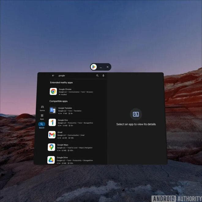 在应用兼容性方面,谷歌 Play 应用商店已开始过滤 XR 应用,并显示与 Android XR 兼容的应用。应用界面采用平板电脑 UI 模式,上方有一个标题栏,用户可以最小化或关闭窗口。