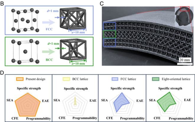 相较于传统的 BCC 点阵结构,它的吸能和能量吸收效率分别提升至前者的 10 倍和 9 倍。