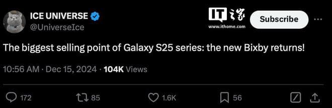 IT之家 12 月 16 日消息,据韩媒 ET News 报道,三星将在明年1月在全球范围内为其Bixby语音助理引入 AI 大模型支持。另参考消息源@i 冰宇宙透露,Bixby 的这一升级据称将成为 Galaxy S25 的“最大卖点”。