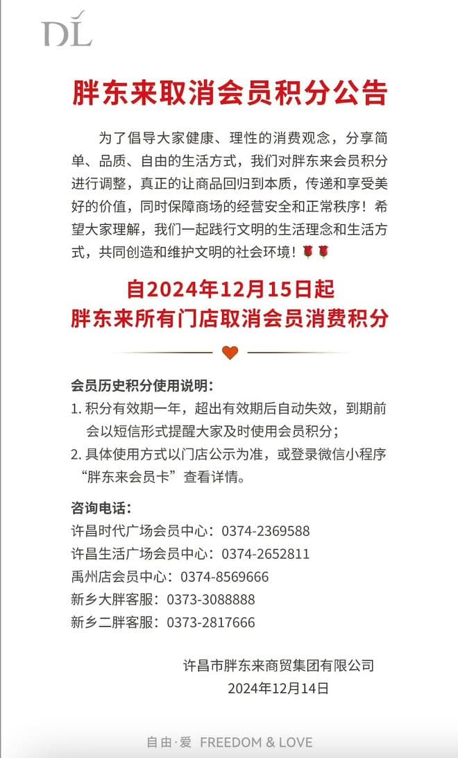 在针对代购的”最严管控“措施后,胖东来又出新公告,所有门店取消会员消费积分。
