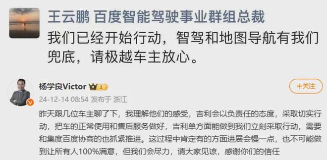 【百度和吉利高管称将兜底极越智驾和售后】12月14日,百度集团副总裁、智能驾驶事业群组总裁王云鹏在朋友圈公开表示:“我们已经开始行动,智驾和地图导航有我们兜底,请极越车主放心。”同日,吉利控股集团高级副总裁杨学良也发布微博称,吉利会以负责任的态度,采取切实行动,把车的正常使用和售后服务做好。
