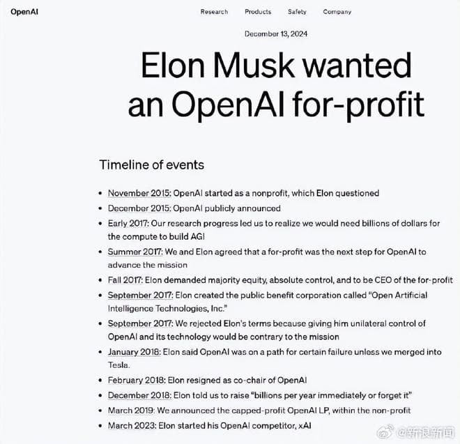 【OpenAI发长文控诉马斯克】当地时间周五,OpenAI公布了多份马斯克与OpenAI数位创始人之间的邮件和聊天记录,通过一系列详实证据驳斥了马斯克的所有指控。在一篇题为“埃隆·马斯克想要一个营利性的OpenAI”的博文中,这家初创公司声称,在2017年,马斯克不仅想要OpenAI转变为营利性公司,而且实际上创造了一个营利性的公司结构。OpenAI指出,当马斯克没有获得OpenAI的多数股权和控制权时,他离开了这家公司,并声称OpenAI会走向失败。(和讯网)
