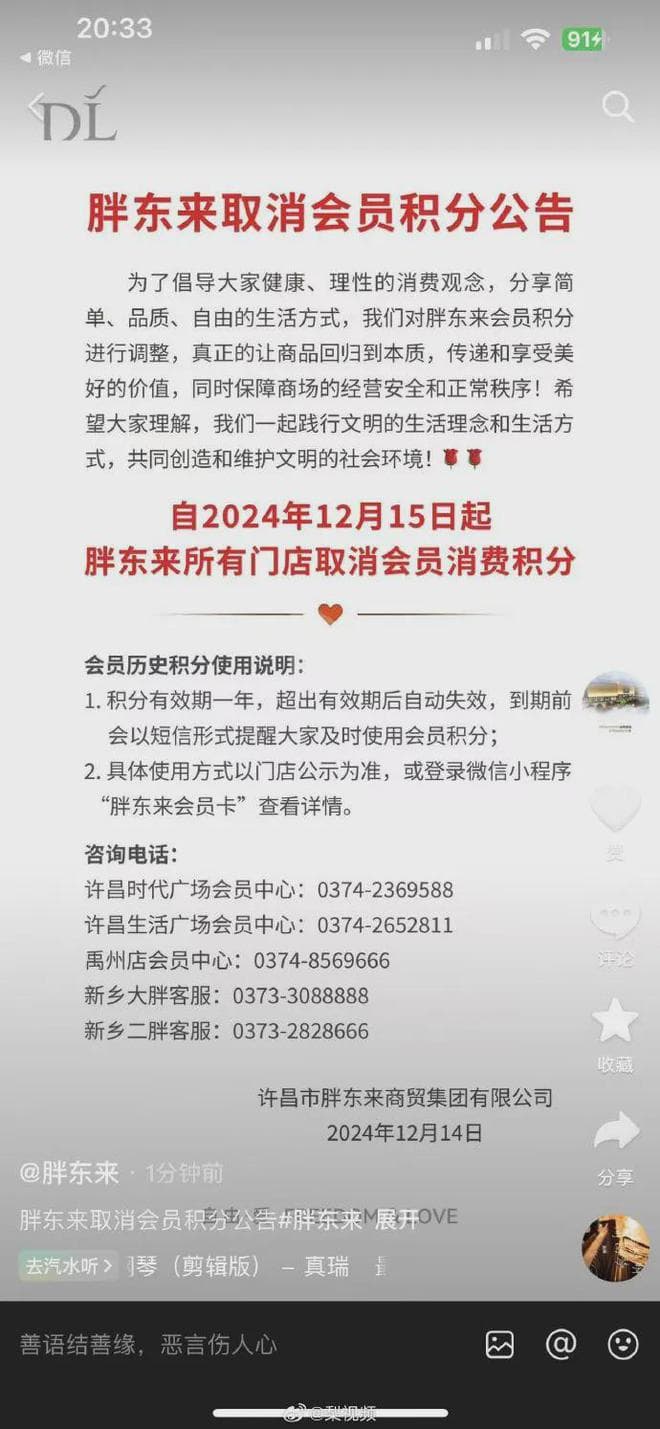 【胖东来公告:自2024年12月15日起所有门店取消会员消费积分】12月14日,胖东来官方账号发文称,自2024年12月15日起胖东来所有门店取消会员消费积分。会员历史积分有效期一年,超出有效期后自动失效,到期前会以短信形式提醒大家及时使用会员积分。(新浪财经)