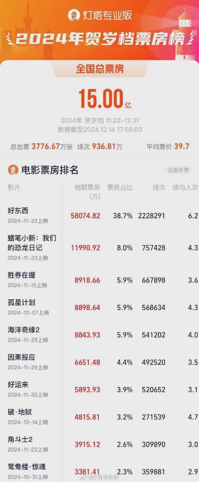 【2024贺岁档票房破15亿】截至12月14日17时58分,2024年贺岁档(11月22日—12月31日)档期票房(含预售)突破15亿。(界面新闻)
