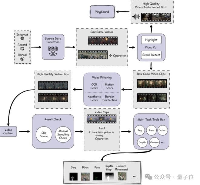 基于场景与高光产出高质量视频片段,其中对高光视频片段进行音频信息提取,作为V2A训练集;基于运动得分、美学评分等进行视频过滤;vLLM-based video caption流程,并对结果进行clip score文本视频对齐评分过滤;多任务数据处理,如分割、主体检测、姿势估计、深度估计、相机运动估计等。