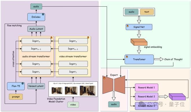 研究团队公开了 YingSound 的两个核心模块:基于 DiT 的 Flow-Matching 构建的音效生成模块,以及多模态思维链(Multi-modal CoT)控制模块,为音效生成提供精准支持。