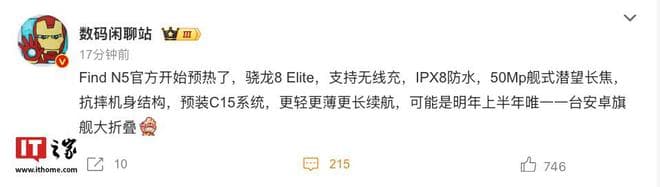 消息称 OPPO Find N5 折叠手机搭骁龙 8 至尊版,支持 IPX8 防水