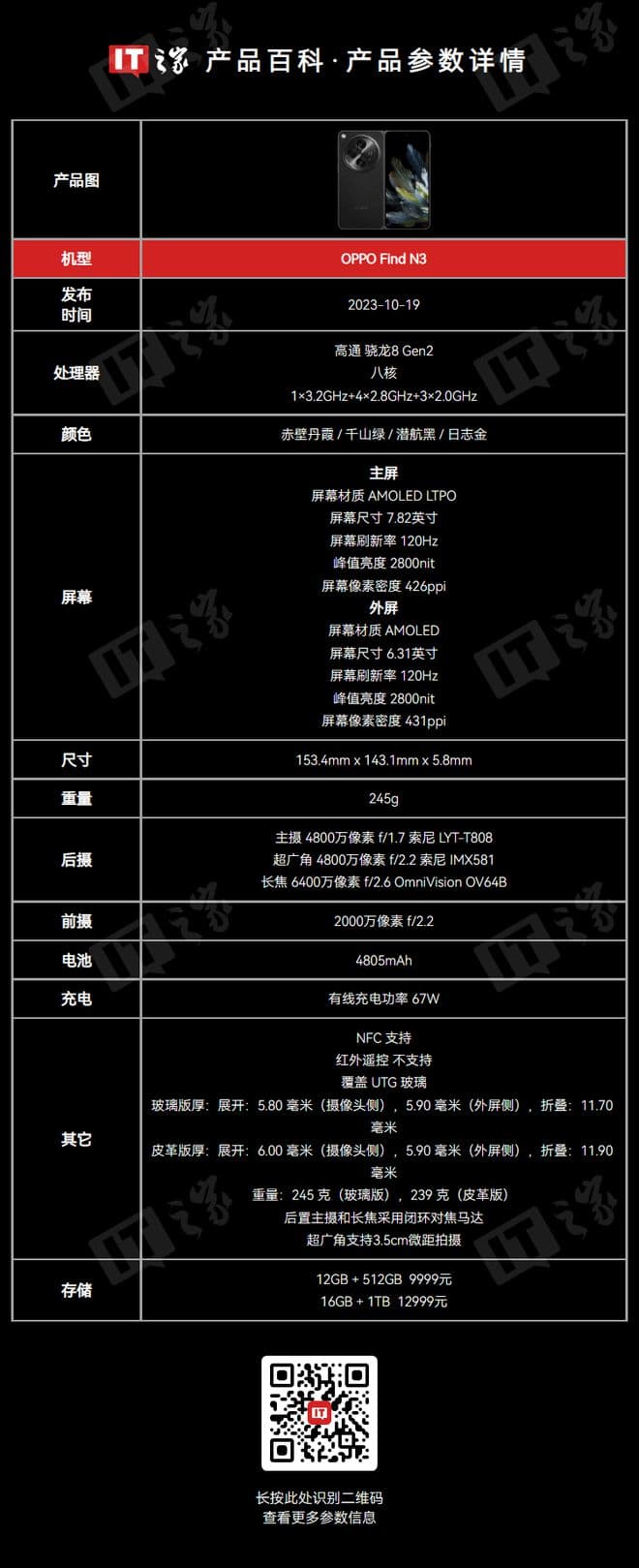 作为参考,OPPO Find N3 折叠屏手机发布于去年 10 月,搭载高通骁龙 8 Gen2 处理器,采用圆形镜头模组设计;该机内外屏均达到 2800nit 动态峰值亮度,支持 120Hz 刷新率(LTPO)。