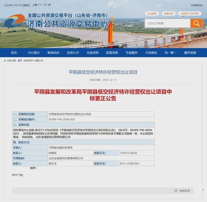 【平阴县低空经济特许经营权出让项目中止招标】12月13日,济南公共资源交易中心发布“平阴县发展和改革局平阴县低空经济特许经营权出让项目中标更正公告”称,11月4日发布的《平阴县低空经济特许经营权出让项目招标公告》(标书号:SDJRY-FW-2024-025),因实施事项和招标公告等问题,经招标单位平阴县发展和改革局与中标单位金宇通航公司协商一致,中止该招标事项。(澎湃新闻)