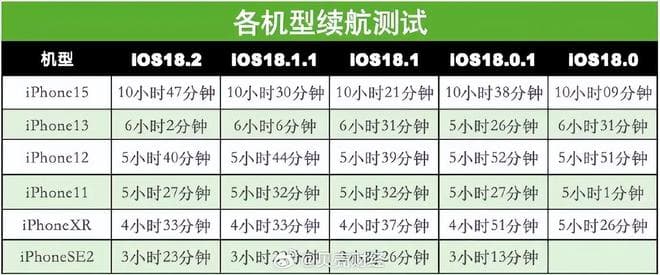 【四款iPhone更新系统后续航降低】苹果最新发布了iOS 18.2正式版,为iPhone 15 Pro和iPhone 16带来了更多AI功能,包括Siri接入ChatGPT、Genmoji和Image Playground等。为了评估iOS 18.2的电池续航表现,iAppleBytes对六款不同型号的iPhone进行了实测。 这六款机型分别为iPhone SE2、iPhone XR、iPhone 11、iPhone 12、iPhone 13和iPhone 15。 结果显示,与iOS 18.1相比,iPhone 13和iPhone 15的续航时间出现了明显变化,分别减少了29分钟和增加了26分钟。iPhone SE 2减少了3分钟,iPhone XR减少了4分钟,iPhone 11减少了5分钟,iPhone 12增加了1分钟。(财经网科技)