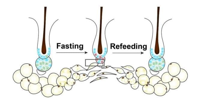 脂肪(浅黄色部分)分解后释放大量游离脂肪酸,刚苏醒的毛囊干细胞(浅绿色部分)开始凋亡,间歇性禁食让此过程不断反复。