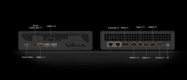 外部接口包括前置USB 3.2 Gen1 Type-A x2、USB 2.0 Type-A、3.5mm音频接口,后置的有USB 3.2 Gen2 Type-A、USB 2.0 Type-A、USB Type-C、HDMI 2.1、DP2.0、OCuLink(PCIe 4.0 x4)以及双2.5GbE网口。