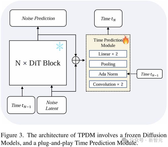 为了实现这一目的,在网络中引入了一个即插即用的时间预测模块(Time Prediction Module, TPM)。这一模块会预测在当前这一个去噪步骤执行完毕之后,模型应当在哪一个diffusion time下进行下一步去噪。