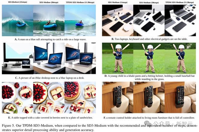 经强化微调后,模型的图像生成质量也比原模型提高了很多。可以看出,在仅仅用了原模型一半生成步数的情况下,无论是图C中的笔记本键盘,图D中的球棒还是图F中的遥控器,该模型生成的结果都比原模型更加自然。