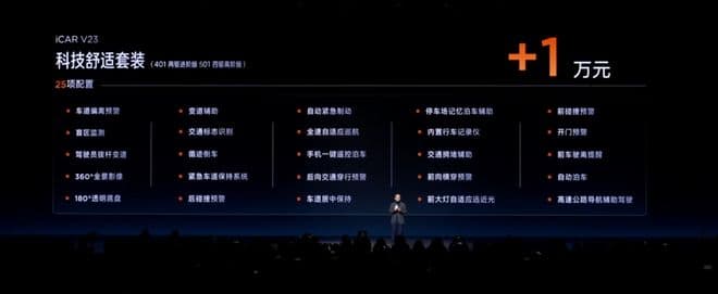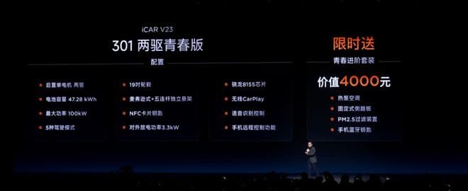 IT之家 12 月 16 日消息,奇瑞汽车旗下 iCAR V23 新车今晚正式上市,该车提供了两款配置,是一款“方盒子”SUV 车型,401 两驱进阶版和 501 四驱高阶版售价分别为 10.98 万元和 13.98 万元。此外,该车还推出一款“尹总(奇瑞汽车董事长尹同跃)送给年轻人的礼物”——301 两驱青春版,价格为 9.98 万元。