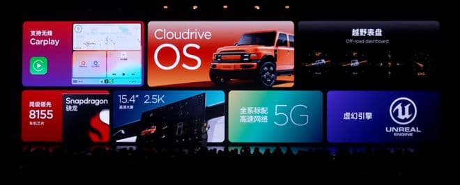 同时,该车可选多种格栅风格,预留了多处改装空间,内置高通骁龙 8155 芯片,支持车载 5G,具备 L2++ 智驾解决方案,支持无线 CarPlay和手机 USB 投屏、主流游戏机等设备的扩展。