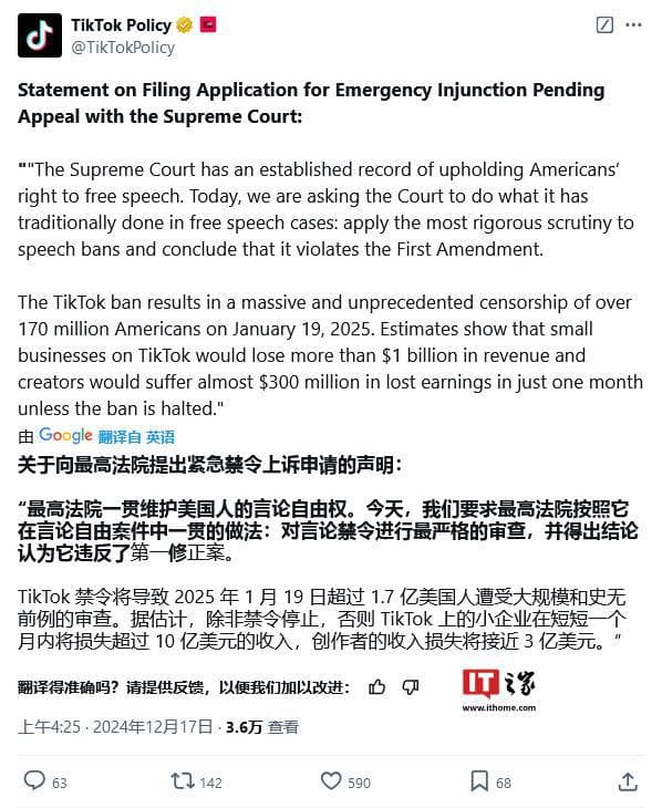 IT之家 12 月 17 日消息,社交网络平台 TikTok 今天(12 月 17 日)在 X 平台发布推文,表示已向美国最高法院提出请求,要求暂缓即将于 1 月 19 日生效的禁令,以便等待上诉程序的进展。