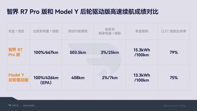 从另一个维度来看,在非常考验电耗的高速工况下,智界R7同样显现出了不俗的技术能力。新出行选取了CLTC工况下续航667km的智界R7 Pro版,实测高速续航526.9km,续航达成率高达79%,同样位居纯电SUV榜单中的NO.1。