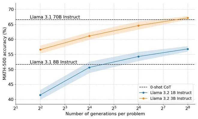 那么,计算最优扩展在实践中效果如何呢?在下图中,如果你给它们足够的「思考时间」,规模很小的 1B 和 3B Llama Instruct 模型在具有挑战性的 MATH-500 基准上,超越了比它们大得多的 8B、70B 模型。