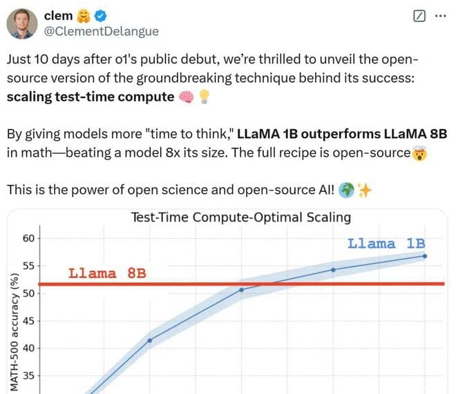 HuggingFace 联合创始人兼 CEO Clem Delangue 表示,在 OpenAI o1 公开亮相仅 10 天后,我们很高兴地揭晓了其成功背后的突破性技术的开源版本:扩展测试时计算。通过给模型更长的「思考时间」,1B 模型可以击败 8B、3B 模型可以击败 70B。当然,完整的技术配方是开源的。